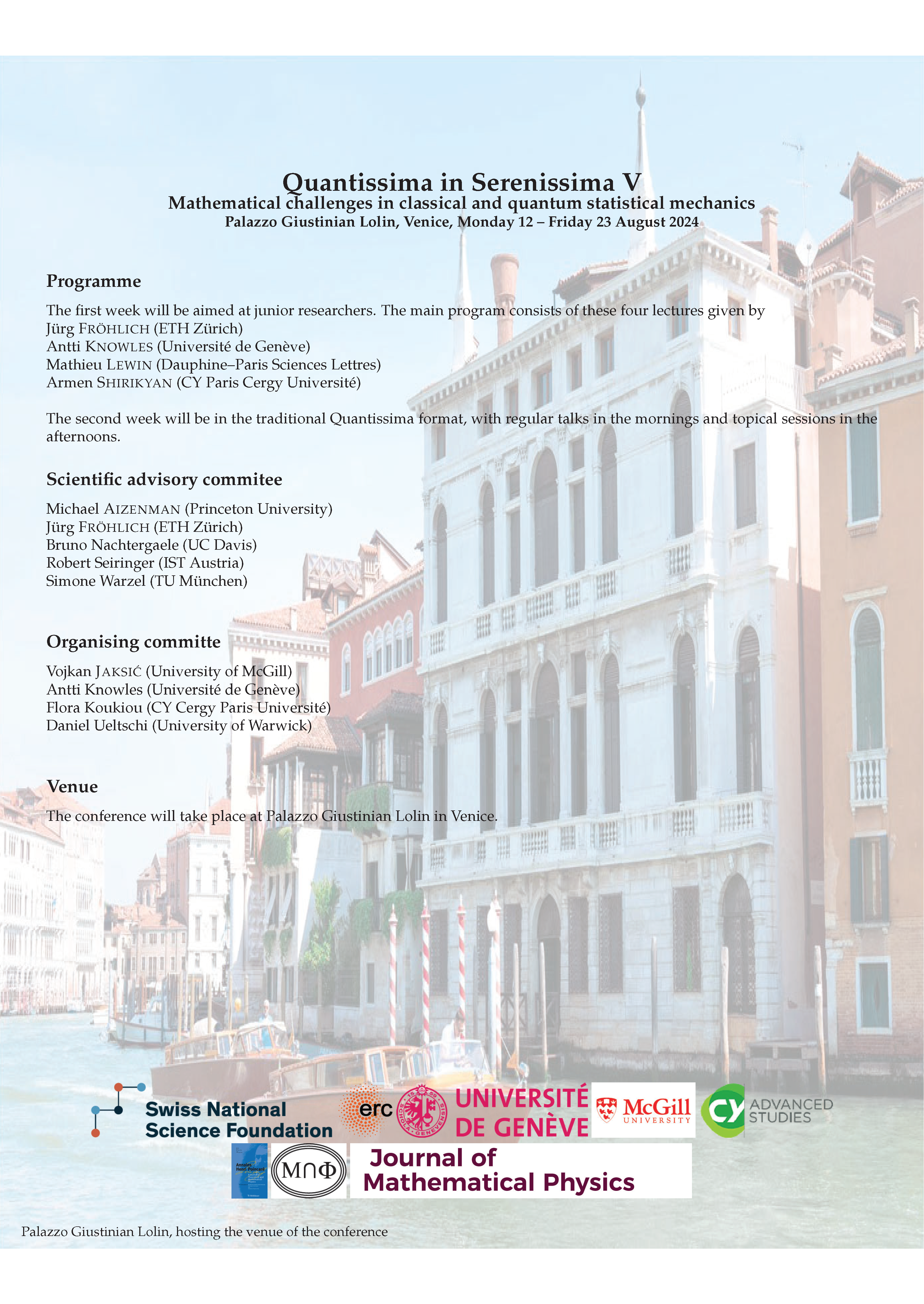 Il s’agit de la cinquième édition de la série consacrée à la mécanique statistique rigoureuse (classique et quantique). La manifestation est composée d’une première semaine d’école d’été, à l’attention des doctorants et jeunes chercheurs, avec quatre cours donnés par Jürg Fröhlich (ETH Zurich), Antti Knowles (Genève), Mathieu Lewin (Dauphine), Armen Shirikyan (CYU) et d’une semaine de conférence spécialisée pour présenter les avancées récentes et les problèmes ouverts du domaine.